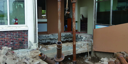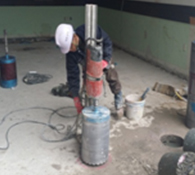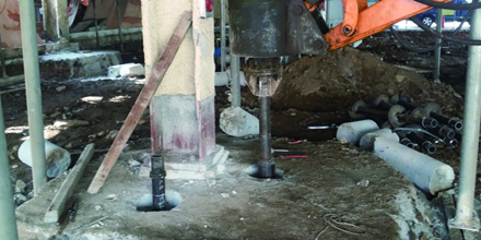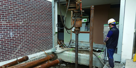 기존건물 기초보강시 코어작업 홀 이용 구기초와 파일간 머리보강 방법